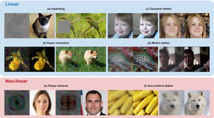 Image credit: Hyungjin ChungDiffusion models have been recently studied as powerful generative inverse problem solvers, owing to their high quality reconstructions and the ease of combining existing iterative solvers. However, most works focus on solving simple linear inverse problems in noiseless settings, which significantly under-represents the complexity of real-world problems. In this work, we extend diffusion solvers to efficiently handle general noisy (non)linear inverse problems via approximation of the posterior sampling. Interestingly, the resulting posterior sampling scheme is a blended version of diffusion sampling with the manifold constrained gradient without a strict measurement consistency projection step, yielding a more desirable generative path in noisy settings compared to the previous studies. Our method demonstrates that diffusion models can incorporate various measurement noise statistics such as Gaussian and Poisson, and also efficiently handle noisy nonlinear inverse problems such as Fourier phase retrieval and non-uniform deblurring.