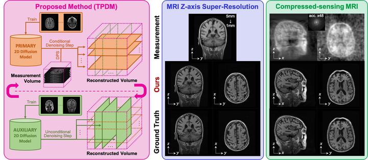 Image credit: Suhyeon LeeDiffusion models have become a popular approach for image generation and reconstruction due to their numerous advantages. However, most diffusion-based inverse problem-solving methods only deal with 2D images, and even recently published 3D methods do not fully exploit the 3D distribution prior. To address this, we propose a novel approach using two perpendicular pre-trained 2D diffusion models to solve the 3D inverse problem. By modeling the 3D data distribution as a product of 2D distributions sliced in different directions, our method effectively addresses the curse of dimensionality. Our experimental results demonstrate that our method is highly effective for 3D medical image reconstruction tasks, including MRI Z-axis super-resolution, compressed sensing MRI, and sparse-view CT. Our method can generate high-quality voxel volumes suitable for medical applications.