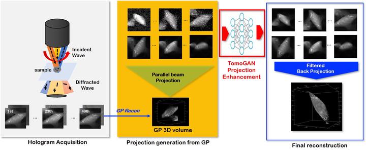 Image credit: Hyungjin ChungOptical diffraction tomography (ODT) produces three dimensional distribution of refractive index (RI) by measuring scattering fields at various angles. Although the distribution of RI index is highly informative, due to the missing cone problem stemming from the limited-angle acquisition of holograms, reconstructions have very poor resolution along axial direction compared to the horizontal imaging plane. To solve this issue, here we present a novel unsupervised deep learning framework, which learns the probability distribution of missing projection views through optimal transport driven cycleGAN. Experimental results show that missing cone artifact in ODT can be significantly resolved by the proposed method.