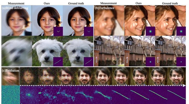 Image credit: Hyungjin ChungDiffusion model-based inverse problem solvers have demonstrated state-of-the-art performance in cases where the forward operator is known (i.e. non-blind). However, the applicability of the method to blind inverse problems has yet to be explored. In this work, we show that we can indeed solve a family of blind inverse problems by constructing another diffusion prior for the forward operator. Specifically, parallel reverse diffusion guided by gradients from the intermediate stages enables joint optimization of both the forward operator parameters as well as the image, such that both are jointly estimated at the end of the parallel reverse diffusion procedure. We show the efficacy of our method on two representative tasks – blind deblurring, and imaging through turbulence – and show that our method yields state-of-the-art performance, while also being flexible to be applicable to general blind inverse problems when we know the functional forms.