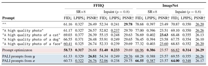 Image credit: Hyungjin ChungWe propose a new method for solving imaging inverse problems using text-to-image latent diffusion models as general priors. Existing methods using latent diffusion models for inverse problems typically rely on simple null text prompts, which can lead to suboptimal performance. To address this limitation, we introduce a method for prompt tuning, which jointly optimizes the text embedding on-the-fly while running the reverse diffusion process. This allows us to generate images that are more faithful to the diffusion prior. In addition, we propose a method to keep the evolution of latent variables within the range space of the encoder, by projection. This helps to reduce image artifacts, a major problem when using latent diffusion models instead of pixel-based diffusion models. Our combined method, called P2L, outperforms both image- and latent-diffusion model-based inverse problem solvers on a variety of tasks, such as super-resolution, deblurring, and inpainting.